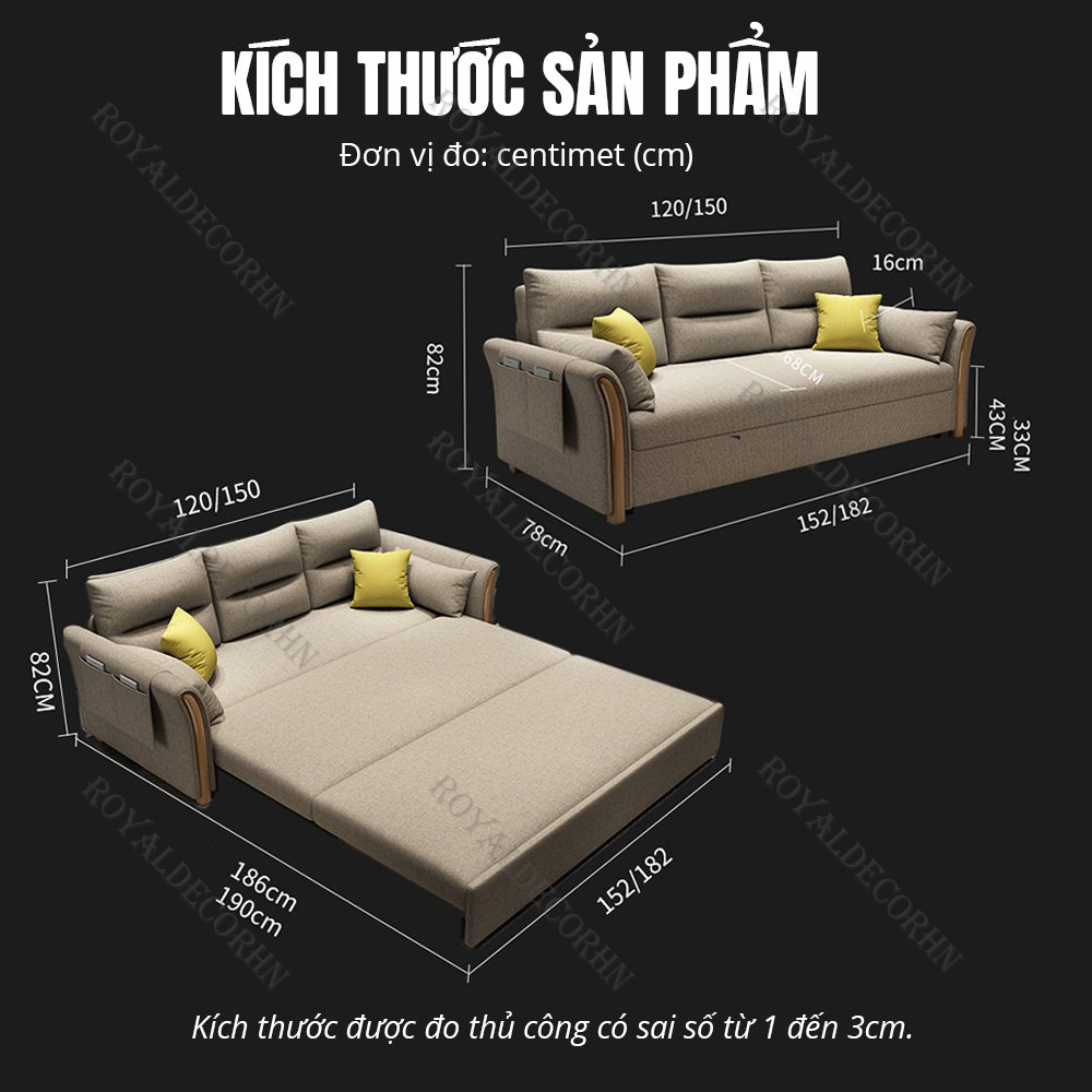 KÍCH THƯỚC | Ghế : 122/152x75x57cm ( DxRxC) Giường : 122/152x190x57 (DxRxC) |